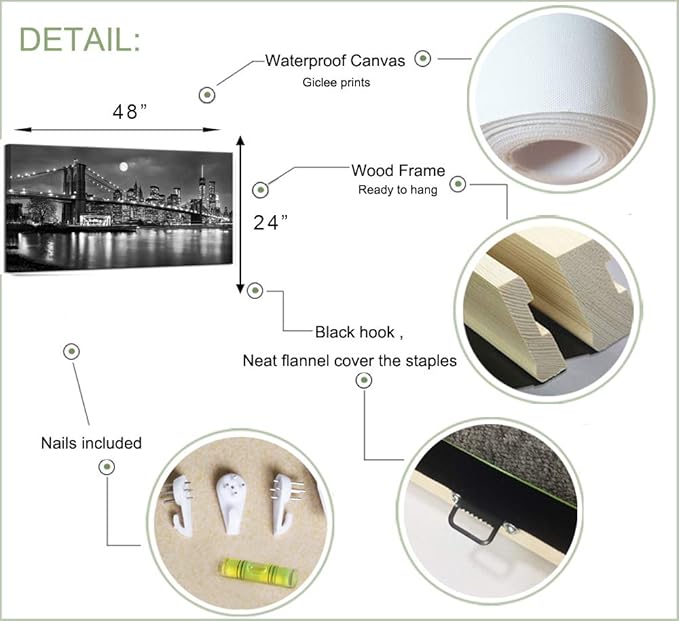 - Each panel canvas art has a black hook already mounted on the wooden bar ready to hang out of box