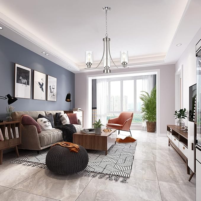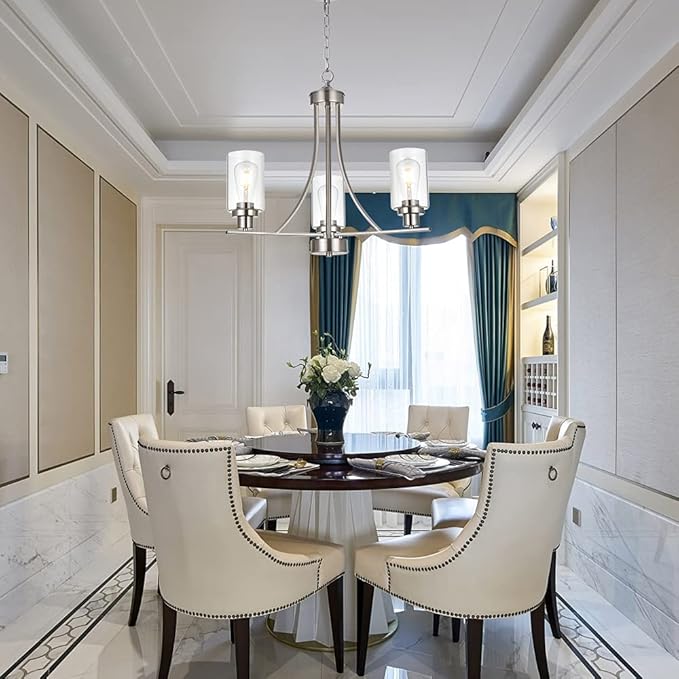 - 💠 3 Light Modern Glass Chandelier: This rustic kitchen dining room chandelier with high clear glass shades,it is an elegant update for traditional and modern homes alike.It's the perfect light fixture to install in kitchen, island, dining room,living room,foyers ,hallway,bedroom,coffee bar, lobby, restaurant and any space you like.
