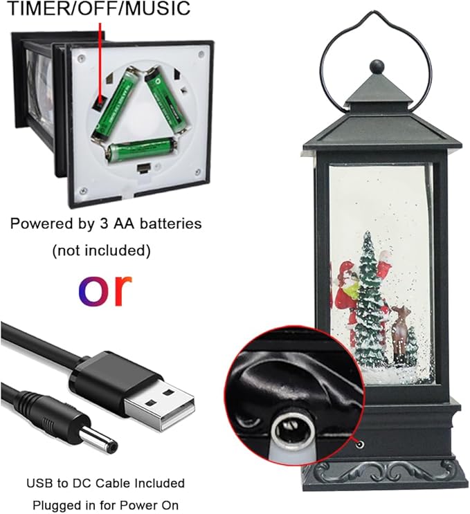 - ★POWER SUPPLY: Included USB to DC cable allows you operate the snow globe lantern without batteries. You can also operate it with 3 AA batteries, so that you can place it anywhere you want.