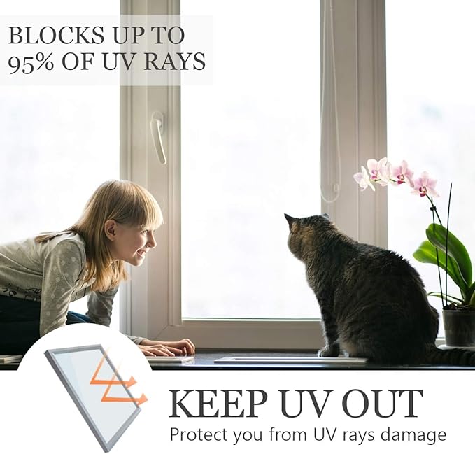 - ANTI UV & HEAT INSULATION: This sun blocking window film blocks out 92% infrared ray and 98% UV ray, there is no more strong dazzling glare, can reduce fading and aging of furniture, also protect our skin. Heat insulation in the summer and heat preservation in the winter to save energy and reduce expensive heating and cooling costs.
