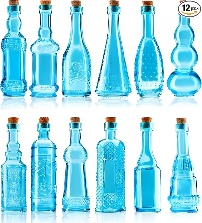 Small Blue Vintage Glass Bottles with Corks, Mini Vases, Decorative, Potion, Assorted Design Set of 12 pcs, 4.6 Inch Tall (11.43cm), 1.4 Inch Wide (3.56cm)