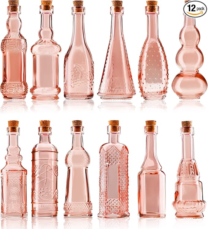 Small MIni Reddish Vintage Glass Bottles with Corks, MIni Vases, Decorative, Potion, Assorted Design Set of 12 pcs, 4.6 Inch Tall (11.43cm), 1.4 Inch Wide (3.56cm)