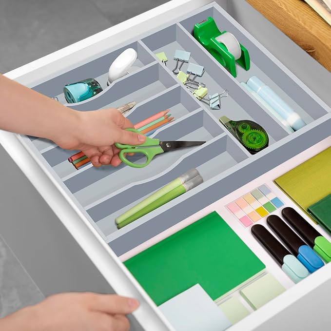 - π‘ππππππππ ππππ ππππ πππππ ππ ππππ: Perfectly crafted to organize your kitchen silverware, dinner flatware sets, the utensil holder helps separate your spoons, knives, forks, & more, making setting the table a breeze! With large capacity & deep grooved edges, the storage tray can also be used to organize your office, bathroom sink drawer, dresser, & craft corner, being perfect to sort pencils, pens, grooming supplies, makeup brushes and lipsticks, or art supplies like paintbrushes and charcoal