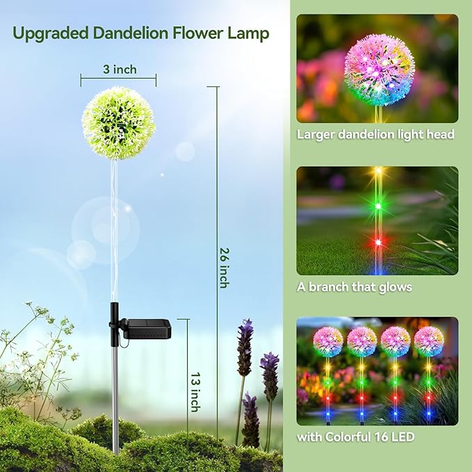 Solar Garden Lights Outdoor Decorations: 4 Pack Dandelion Flower Lights, 2 Modes Colorful 16 LED Landscape Light, Waterproof Artificial Flowers for Yard, Patio, Pathway Decor, Gifts for Women Mom