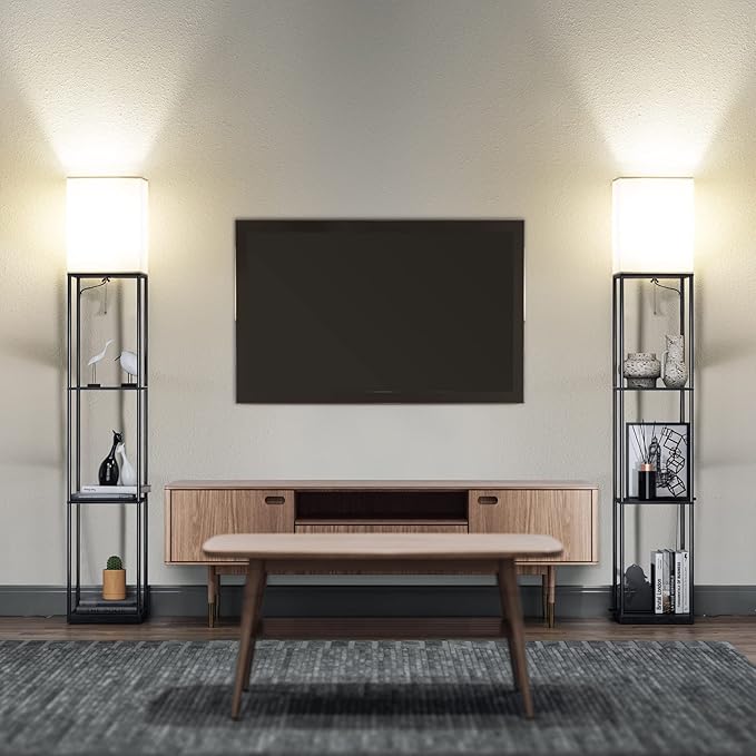 - Non-glaring Cloth Lampshade: This shelf floor lamp is equipped with a high-quality off-white cloth lampshade and opens upwards; With the built-in three-color temperature bulb, it can be used for both functional lighting and ambient lighting, It is a piece of furniture that can decorate any style of room