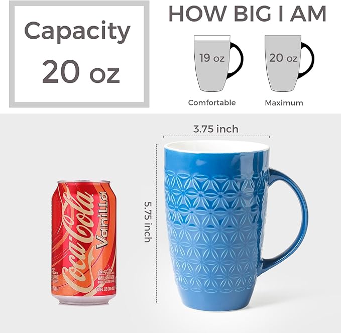 AmorArc Extra Large Coffee Mugs Set of 6, 20oz Ceramic Tall Coffee Mugs Set with Textured Geometric Patterns for Latte/Tea/Beer/Hot Cocoa, Dishwasher & Microwave Safe, Blue