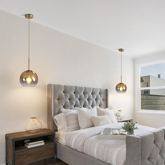 - Unique Gradient Gold Glass Shade: The rose gold and glass pendant light is made of metal and glass, the glass lamp shade is not normal clear or white color, it’s gradient gold color, which is more attractive than ordinary glass. When the gold pendant light is turned on, it emit a beautiful light, bright and very charming