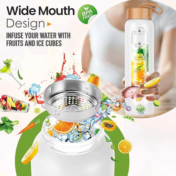 - Innovative and Convenient: The Aqulea wide mouth water bottle glass package comes with a leak-proof glass bottle with bamboo lid, a non-slip protective silicone sleeve for easy grip and maximum impact protection, an 18/8 stainless steel strainer for infusion water bottle, and a retractable brush