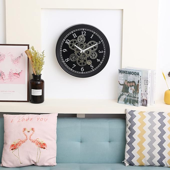 - [Unique Exposed Moving Gears] Industrial decor inspired, when you put 3 AA batteries in, various exposed aged gold cog start rotating, definitely an eye-catching wall décor gears clock for your home, surely capture anyone's attention