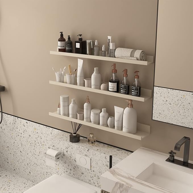 - Multi-Size Shelves Set: The 3 pack 36” long shelves varying in width and depth, large shelf 36.02 x 5.51 x 2.68 inches, medium shelf 36.02 x 4.69 x 2.32 inches, small shelf 36.02 x 3.82 x 2 inches. They provide enough space for your utility and display purposes. (PLS NOTE: It is not pure white, it is more of a beige or light grayish woodgrain white, but it is still chic )