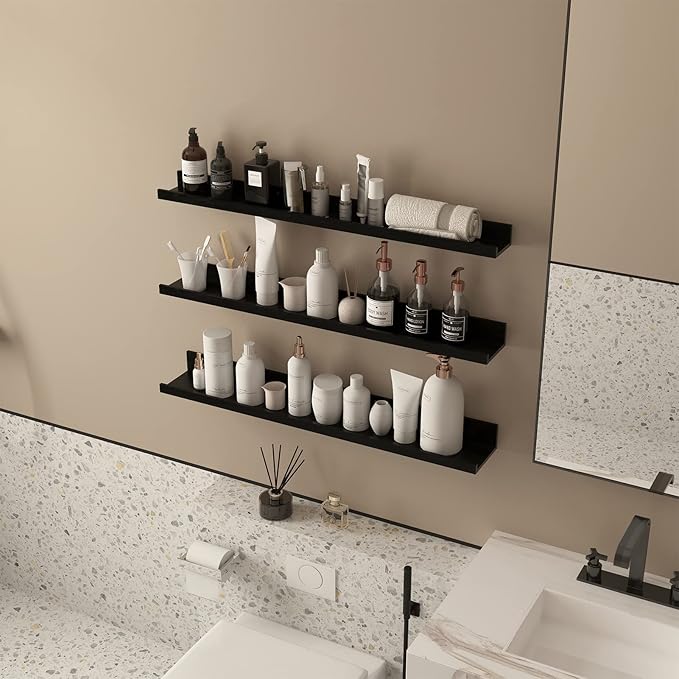 - Ledge Design: Its classic U-shape front lips prevent items from falling off or sliding forward. Set of 3 different shelf sizes, Large: 36x4.8x2.6 inches, Middle: 36x3.9x2.3 inches; Small: 36x3x1.9 inches.