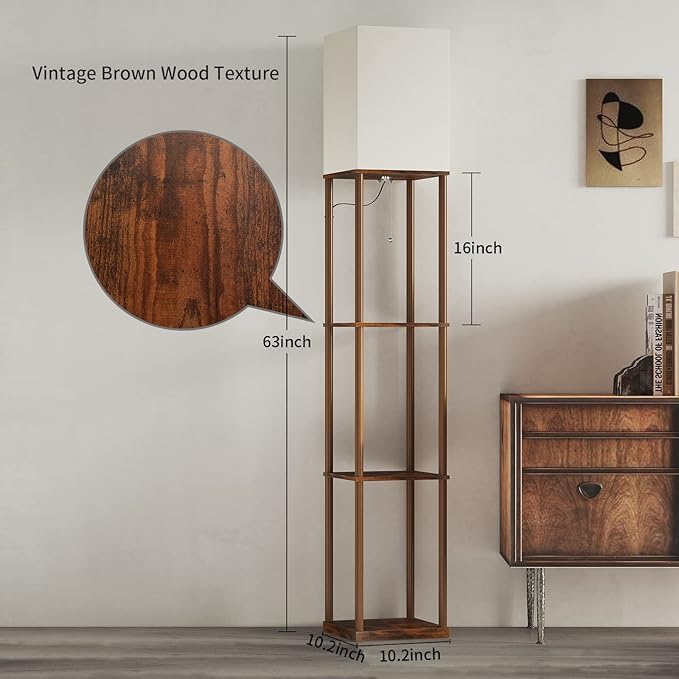 SUNMORY Floor Lamp with Shelves, Modern Square Standing Lamp with 3 Color Temperature Bulb, Corner Display Bookshelf Lamp for Living Room and Bedroom (Rustic Brown)