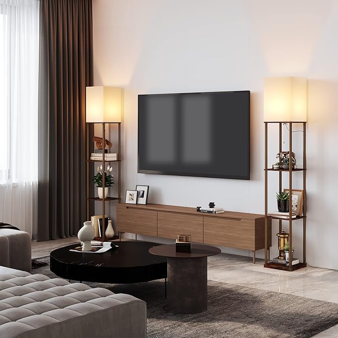 - Non-glaring Cloth Lampshade: This shelf floor lamp is equipped with a high-quality off-white cloth lampshade and opens upwards. With the built-in three-color temperature bulb, it can be used for both functional lighting and ambient lighting.