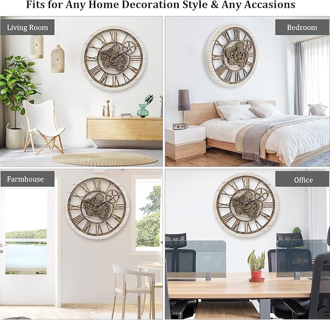 - 【Clocks for Living Room Decor】 It is not only a clock, but also a high value home decor for your living space to catching eyes. Bringing the highest qualities of craftsmanship retro decor into your home. The wall clock can be used in your room decor, living room, dining-room, farmhouse, bedroom, kitchen, entrance, stair, office, schools, hallway, bar, restaurant, coffee, clothing store etc. Perfect with any home style décor such as modern, vintage, farmhouse, industrial, steampunk etc.