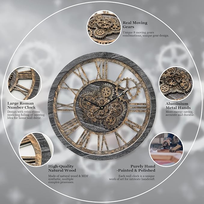 - 【Real Moving Gear Clock】All gears for the wall clock are real moving! Design with rustic bronze-color and industrial style. An creative combination of four gears for a retro look, has a very exquisite decorative effect makes the wall clock become a chic art works. The large wall clock crafted of nature wood & MDF. Big roman numeral numbers and wood rustic moving gears perfect for any room decor.