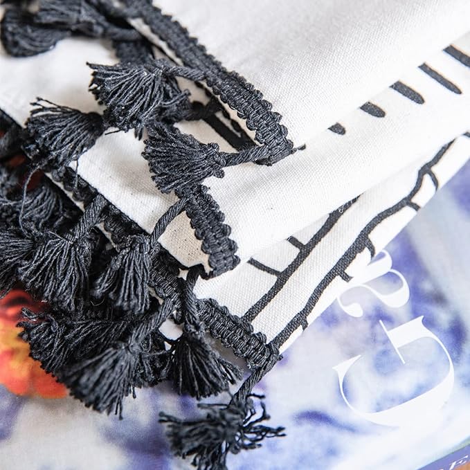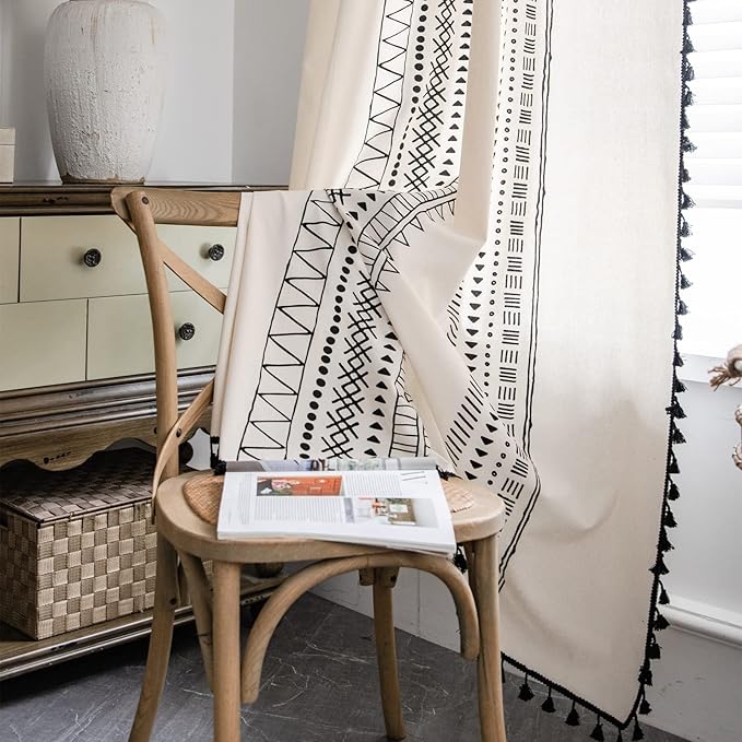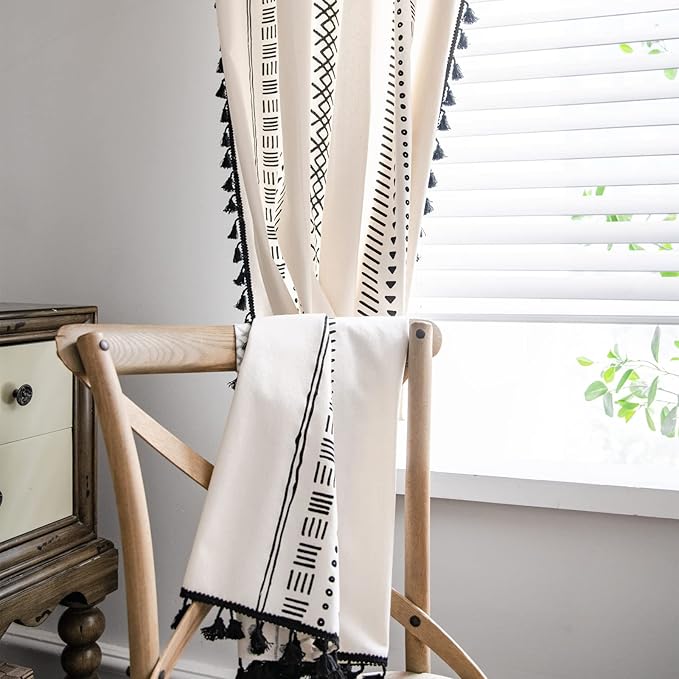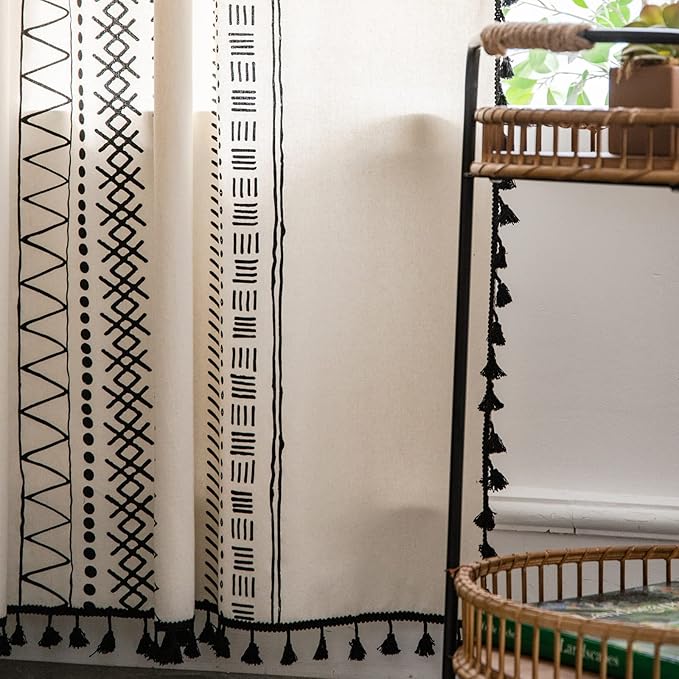 Sutuo Home Boho Curtain 84 Inches Length for Bedroom, Printed Cotton Linen Geometry Rod Pocket Chic Semi Blackout Bohemian Tassels Window Treatment for Living Room, 1 Panel 59" W x 84" L, Black