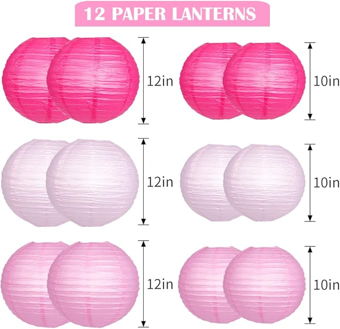 - PAPER LANTERN SET INCLUDED- Pink party decorations set including 6 pieces of 10 inch paper lanterns, 6 pieces of 12 inch paper lanterns, 12 pieces of battery operated mini LED lights, set comes in pink and hot pink colors