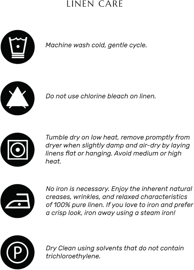 - ๐๐ฎ๐๐ ๐๐ฎ๐ฟ๐ฒ : ๐ ๐ฎ๐ฐ๐ต๐ถ๐ป๐ฒ ๐ช๐ฎ๐๐ต๐ฎ๐ฏ๐น๐ฒ, Low Iron as Needed, Steam Iron for a crisp look. Pure Linen mellows with each washing, betters with age and requires minimal care.