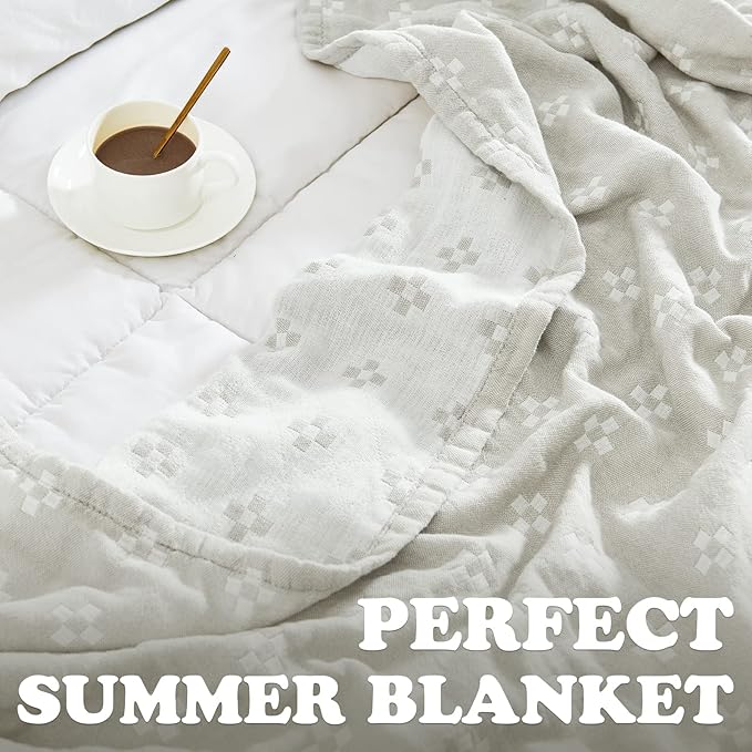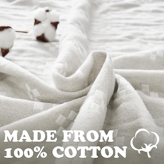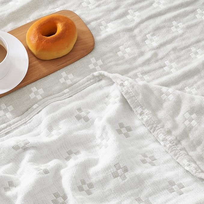 jinchan Boho 100% Cotton Blanket Muslin 50x60 Inches Lightweight 3-Layer Geometric Cross Pattern Reversible Quilt Throw Soft Breathable Comfy All Seasons for Couch Bed Decor, Light Grey