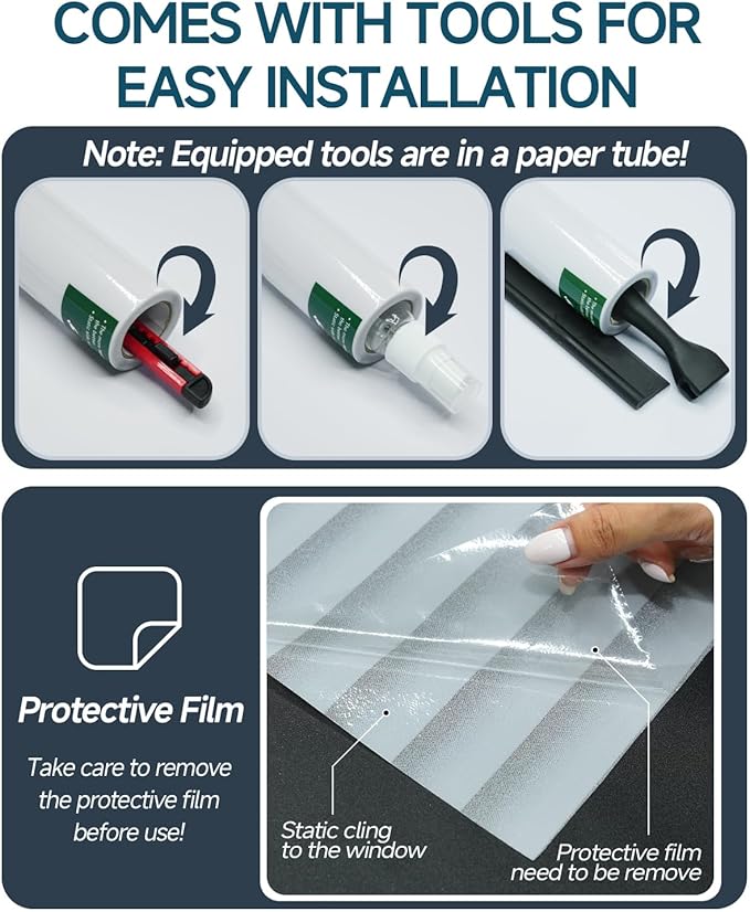 - [Installation Tips]: Please make sure that the surface, edges and corners of the window are clean enough without any dust, and remember to remove the transparent back film before installation; During installation, spray plenty of water on the surface of the window and on the back of the window privacy film to ensure effective adhesion! Note: Not for use with frosted, cut or machined glass that does not have a smooth surface