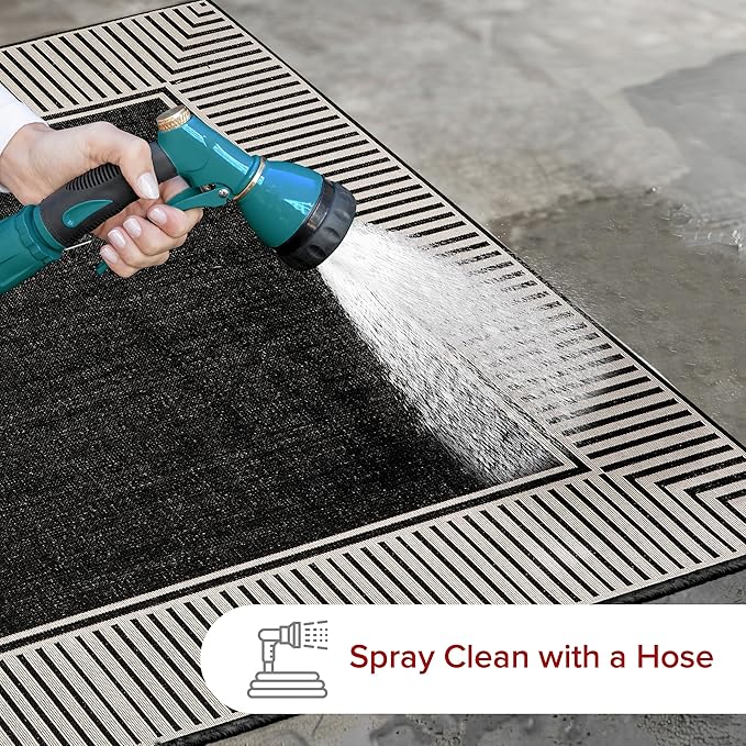 - Outdoor Rug Care Instructions: Easy to care for, simply shake out your outdoor rug to remove any light dirt or debris and spray your area rug with a hose for stubborn stains. This is the perfect patio rug or front porch rug to elevate your home.
