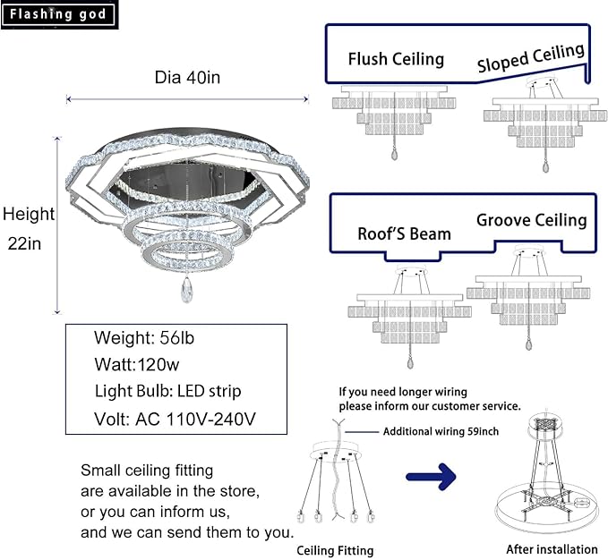 - 【Modern Crystal Ceiling Lights Size】Specifications: W40" x H25". Voltage options: DC 110V, 120V, 220V, and 240V.