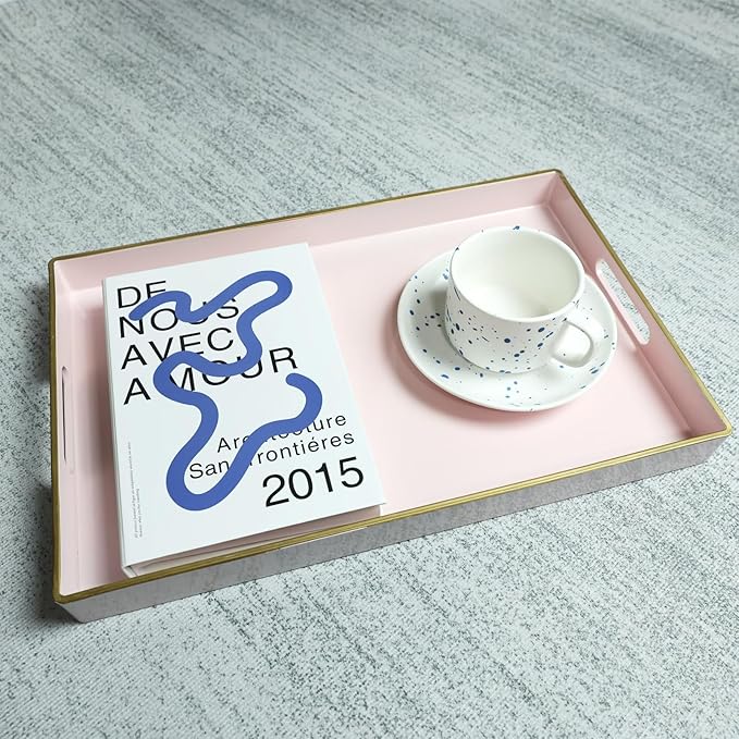 Spsyrine Pink Decorative Serving Tray with Handles, Elegant Plastic Coffee Table Tray for Ottoman, Living Room, Home Decor 15.6" X 10.2"