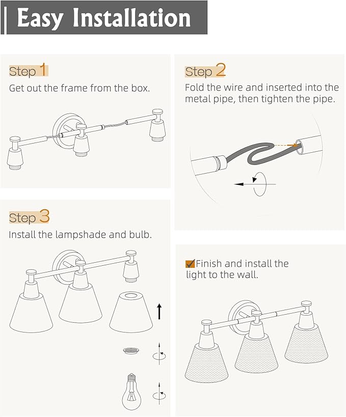 - 【Bulb Requirements】Support any E26 base bulbs ( Max 60W/each, bulbs are not included). This 3-light vanity light is also designed to be dimmable when used with a dimmable bulb and a compatible dimmer switch.