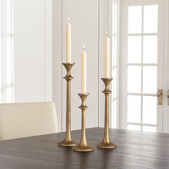 - Rustic texture and a golden antique brass finish give these classically shaped candle holders their vintage vibe. The set of three candle holders includes small, medium and tall sizes. Fill with standard taper candles (not included) and cluster for striking, multi-level display