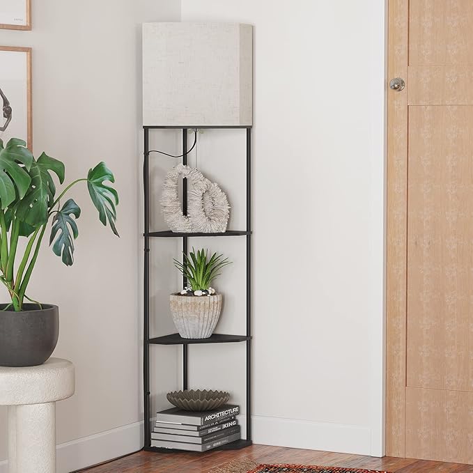 SUNMORY Sector Corner Shelf Lamp 3 Color Temperatures LED Bulb,Corner Lamps with Linen Lampshade, Floor Lamps for Living Room, Bedroom, Study, Black Standing Lamp with Shelves