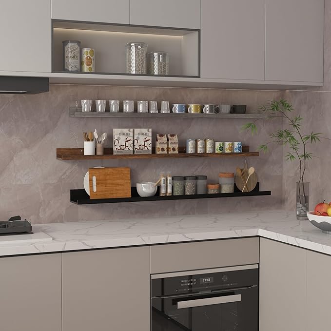 - Multi-functional storage: This large wall mounted shelving unit provides ample storage space to keep your home organized and tidy. To meet your different storage needs in different places, this floating shelf set offers multiple storage spaces in different sizes.