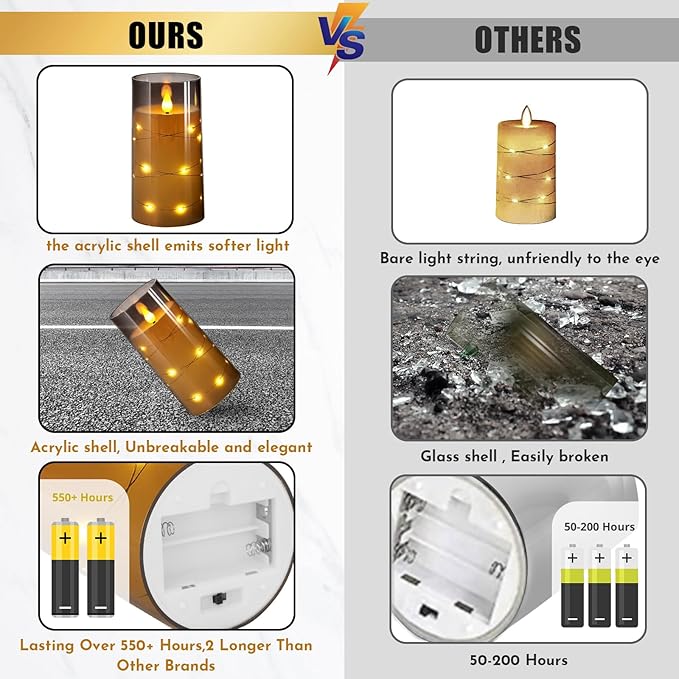 - 3D Wick and Realistic Appearance, Unbreakable Design - Made of premium acrylic, 3D black wick realistic flicker design. Compared with glass radiance candles, premium imitation glass acrylic shells make the battery candles stronger and long-lasting. Through the clear shell, feels and looks like real wax pillar candle flame