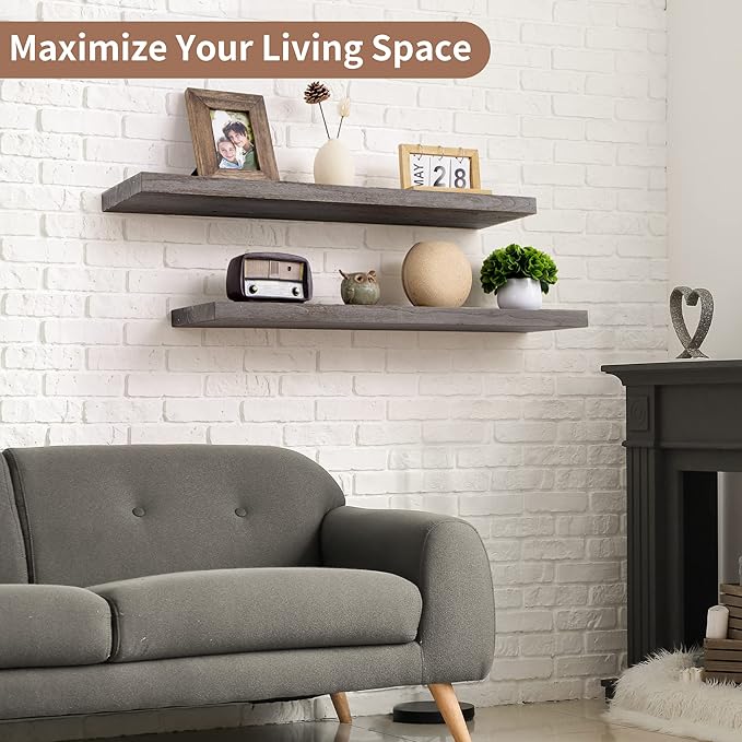 - 8" DEEP-MORE SPACE MORE TIDINESS: Axeman 36 inch floating shelves are designed to be deeper and thicker than traditional floating shelves, with a thickness of 1.37 inches and a depth of 8 inches. You can display a variety of items, such as photos, books, and knickknacks on these sturdy and spacious natural wood floating shelves