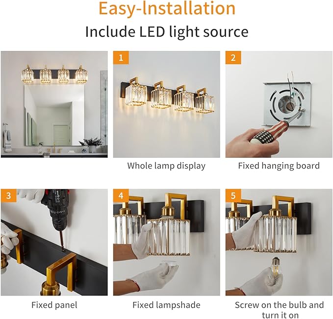 - 【Easy Installation】This is designed for US standard junction box, no complicated installation procedure is needed. All required parts are included in the package with additional replacement crystal strips. Note: For your safety, please install the vanity light under the guidance of an electrician.