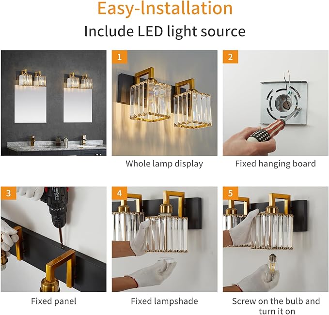 - 【Easy Installation】This is designed for US standard junction box, no complicated installation procedure is needed. All required parts are included in the package with additional replacement crystal strips. Note: For your safety, please install the vanity light under the guidance of an electrician.