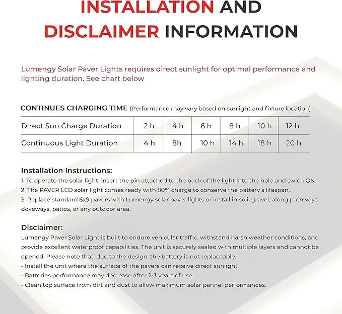 - Important Information – Lumengy solar lights require direct sunlight to charge properly. For best results, ensure the solar panel remains clean and fully exposed. Shade, clouds, or debris may reduce charging performance. The battery is sealed and non-replaceable to maintain full waterproof integrity.