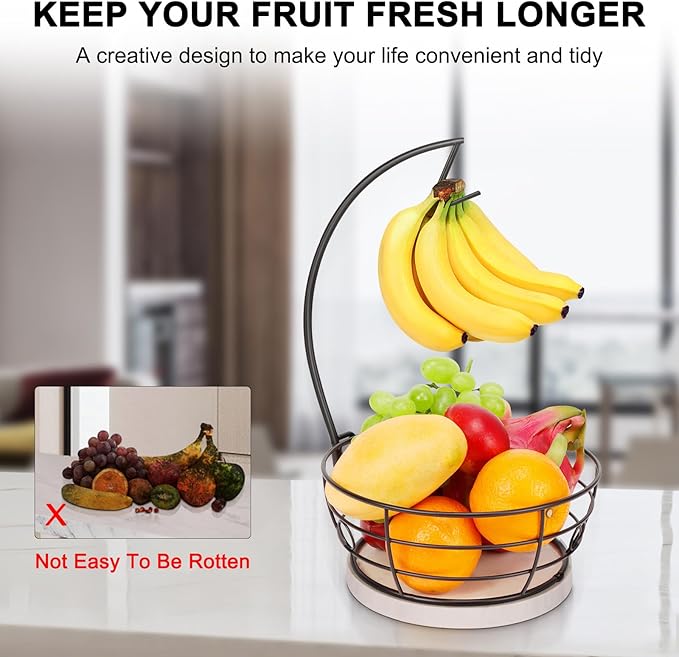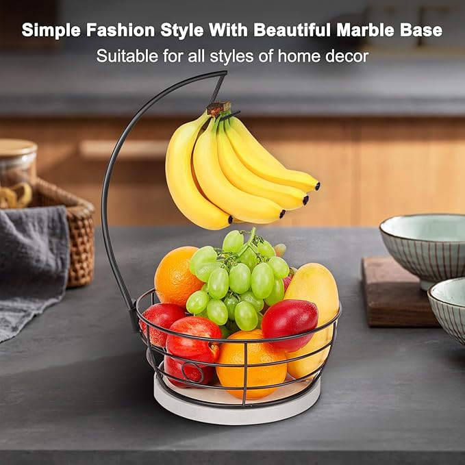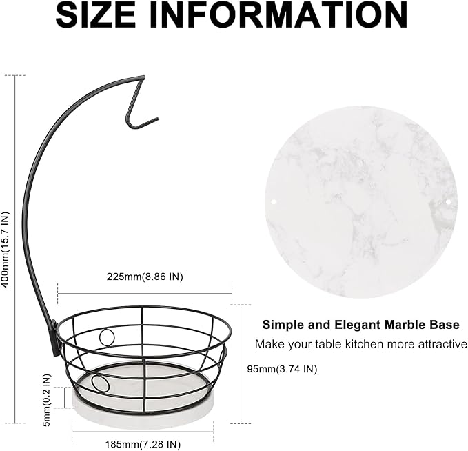 - BEAUTIFUL MARBLE BASE: Each marble base has an unique charming color and texture. Its elegant and stylish look makes the banana hanger with fruit basket more attractive. Heavy weighted design of marble base is stable to protect banana hanger from falling when take out bananas.
