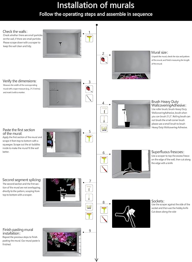 - Construction Installation: Each part of the mural is marked with a serial number underneath, no overlap, direct docking, in order. (Please refer to installation instructions)