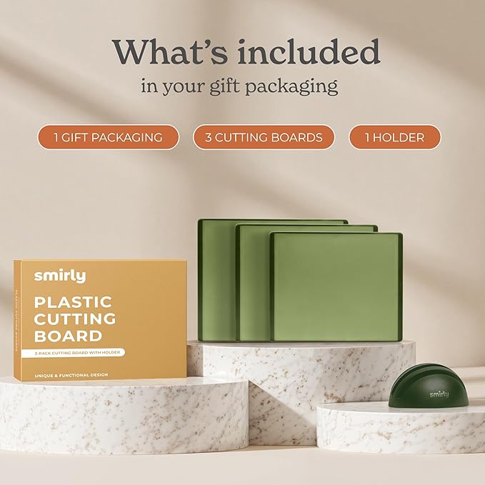 - 3-Pack with Holder: This cutting board set includes small, medium, and large cutting board sizes for every prep need. It also comes with a compact holder that neatly organizes all boards vertically, keeping your countertops clutter-free while ready for any chopping task.