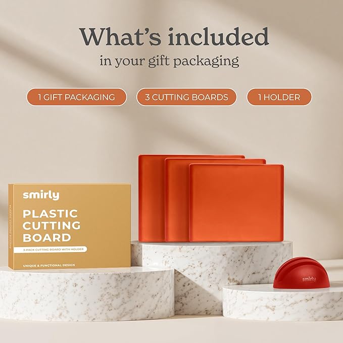 - 3-Pack with Holder: This cutting board set includes small, medium, and large cutting board sizes for every prep need. It also comes with a compact holder that neatly organizes all boards vertically, keeping your countertops clutter-free while ready for any chopping task.