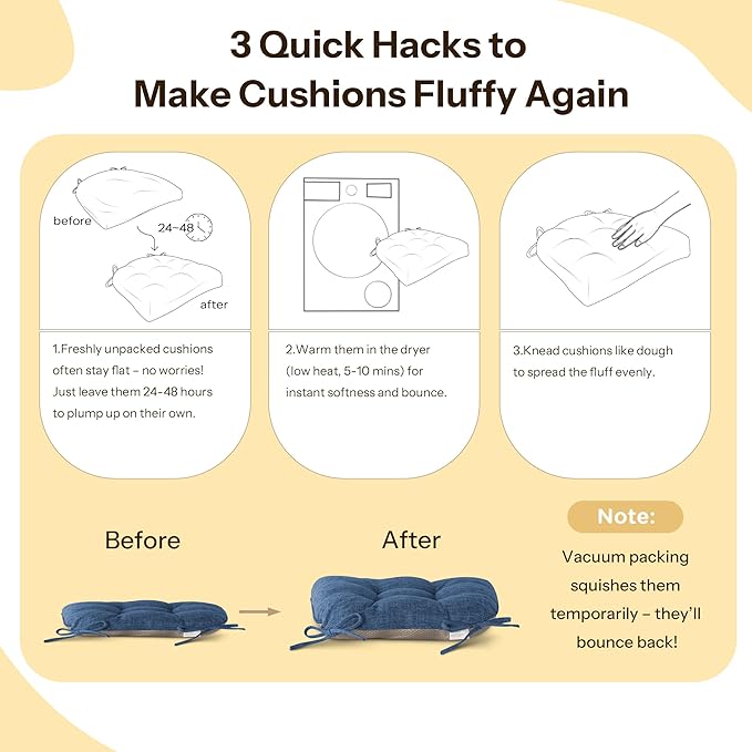 - Large Size Design: Our kitchen chair cushions set of 4 measures 18" x 18" x 3", perfect for most dining chairs, kitchen chairs, and office chairs, instantly transforming hard seats into cozy, stylish seating solutions for any room. The chair cushions for dining chairs are vacuum-packed for shipping. Upon receiving them you can simply follow the easy steps to fluff it for optimal comfort.