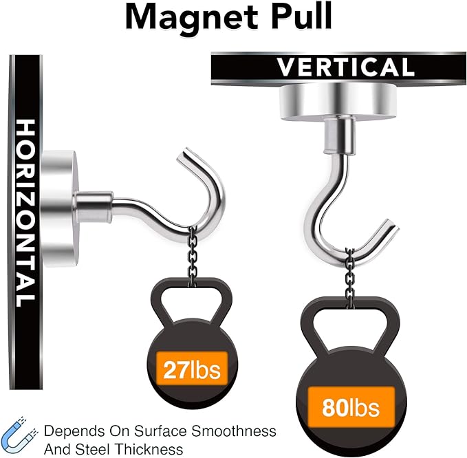 - 【STRONG ADHESION】: Our strong magnets with hooks are made of powerful neodymium magnets, which can reach 80LB horizontally and 26LB vertically. They firmly stick to metal surfaces, ensuring stable and reliable hanging. All hooks are designed to be heavy-duty magnets, capable of supporting substantial weight.