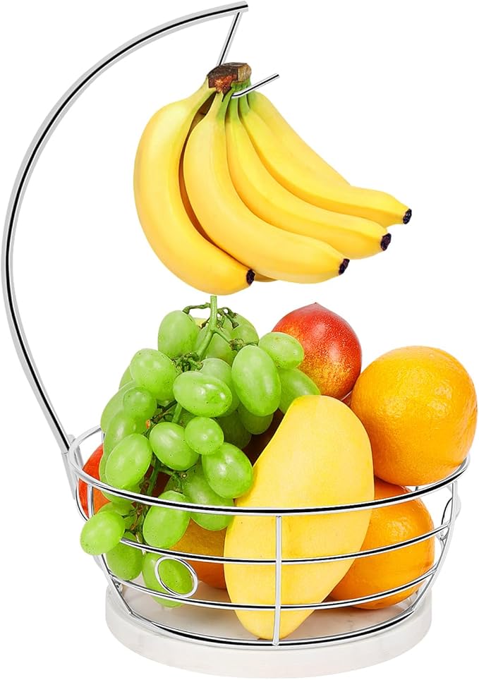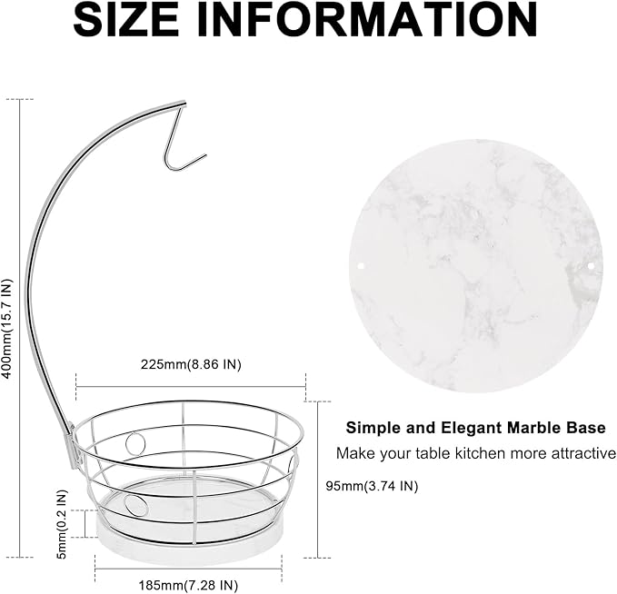 - BEAUTIFUL MARBLE BASE: Each marble base has an unique charming color and texture. Its elegant and stylish look makes the banana hanger with fruit basket more attractive. Heavy weighted design of marble base is stable to protect banana hanger from falling when take out bananas.