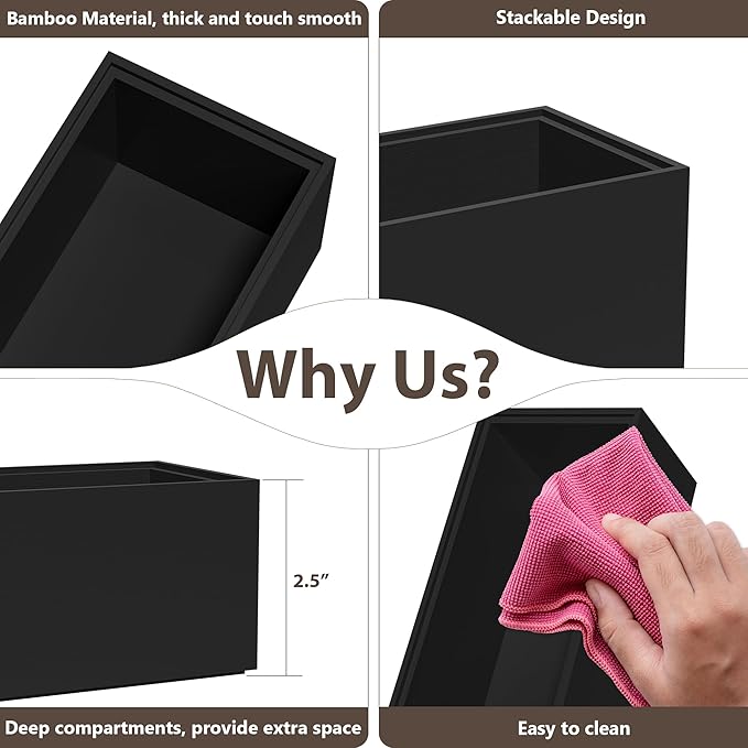 Kitchen Drawer Organizer Bins, Black Bamboo Drawer Organizer Stackable for Silverware, Utensils, Cutlery, Flatware, for Junk Drawer, Dresser, Bathroom, 12" x 3" x 2.5" (Set of 2)