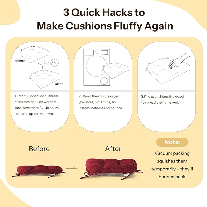 - Large Size Design: Our kitchen chair cushions set of 4 measures 18" x 18" x 3", perfect for most dining chairs, kitchen chairs, and office chairs, instantly transforming hard seats into cozy, stylish seating solutions for any room. The chair cushions for dining chairs are vacuum-packed for shipping. Upon receiving them you can simply follow the easy steps to fluff it for optimal comfort.