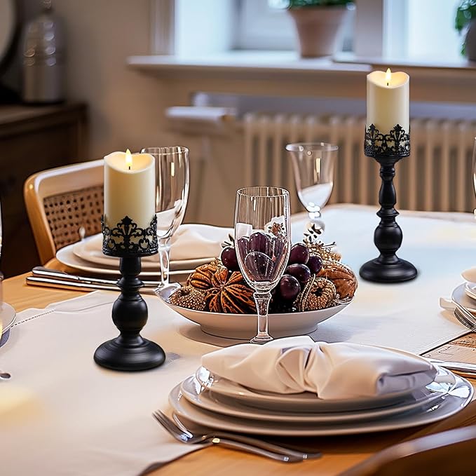 - 【Material】: The pillar candle holder is made of high-quality iron and is light but strong. The surface is black and will last for years. Metal candle holders set of 2 can hold real candles or LED candles.