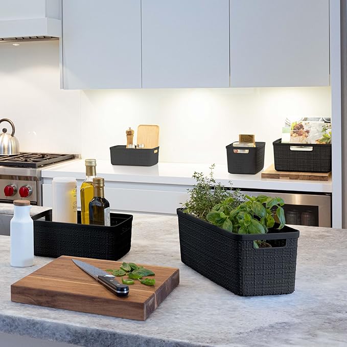 Curver Set of 8 Jute Slim Decorative Plastic Organization and Storage Baskets, Perfect Bins for Home Office, Closet Shelves, Kitchen Pantry and All Bedroom Essentials, Black
