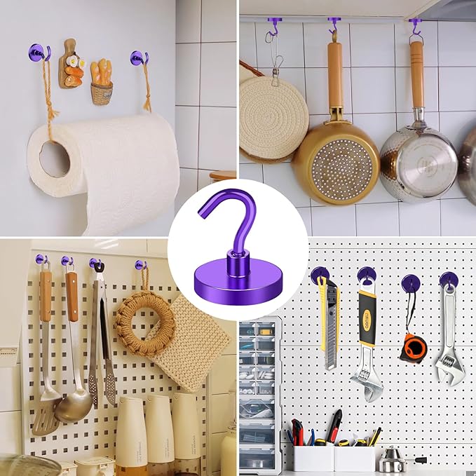 MIKEDE Strong Magnetic Hooks, 110Lbs Heavy Duty Magnetic Hooks for Cruise, Neodymium Earth Magnets with Hooks for Hanging, Super Metal Industrial Magnets for Grill, Storage (Purple,10 Pack)