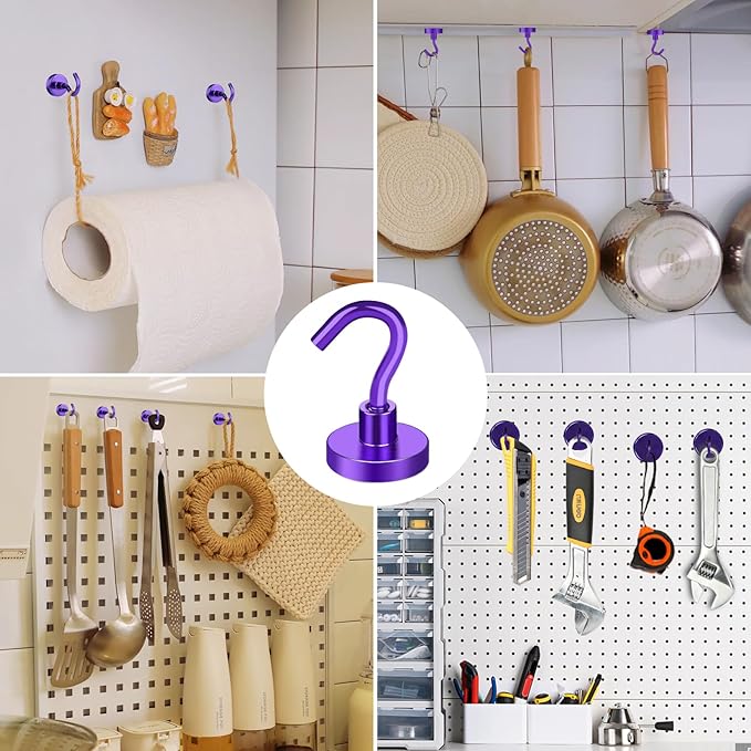 MIKEDE Magnetic Hooks Heavy Duty, 28Lbs Neodymium Magnets with Hooks for Refrigerator, 10Pcs Strong Cruise Hooks for Hanging, Magnetic Hanger for Grill, Toolbox, Storage - Purple