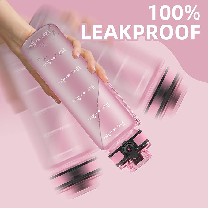 OLDLEY 32 oz Water Bottle, Motivational Water Bottle with Time Marker, Sports Water Bottle With Strap, Leakproof & BPA Free Large Water Bottles for School, Gym, Travel, Outdoor, Tritan,Pink